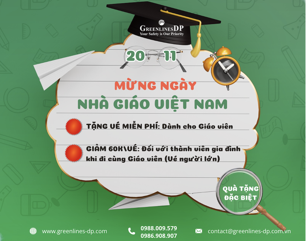 🌊 GreenlinesDP rất mong có cơ hội được đồng hành cùng Quý Thầy/Cô và gia đình trong một chuyến đi thật ấm áp, ý nghĩa – như một lời cảm ơn cho những hy sinh thầm lặng mà Thầy/Cô đã dành cho bao thế hệ học trò.